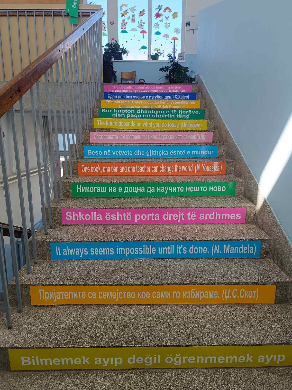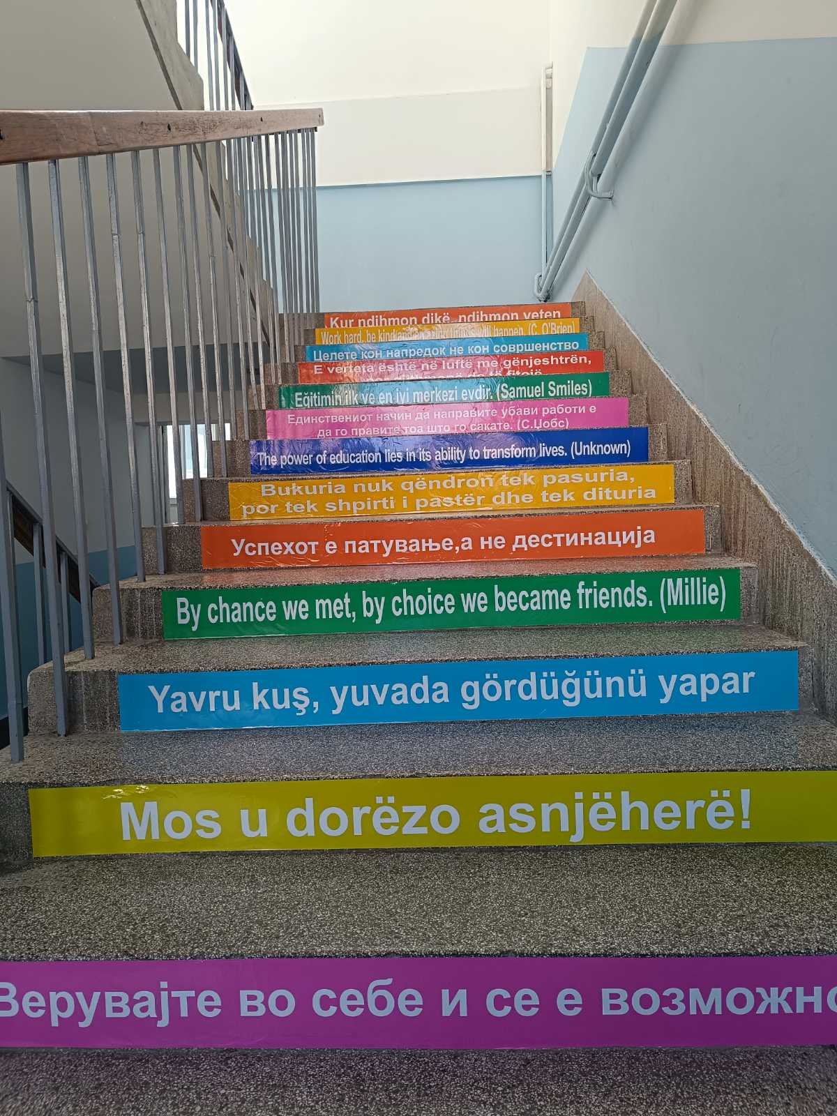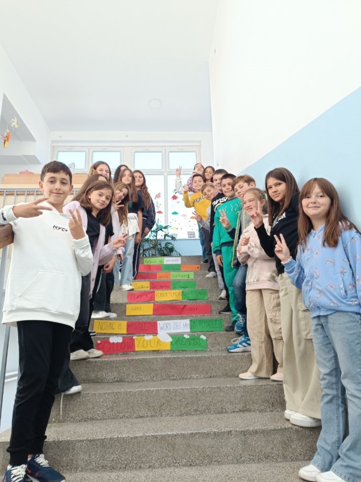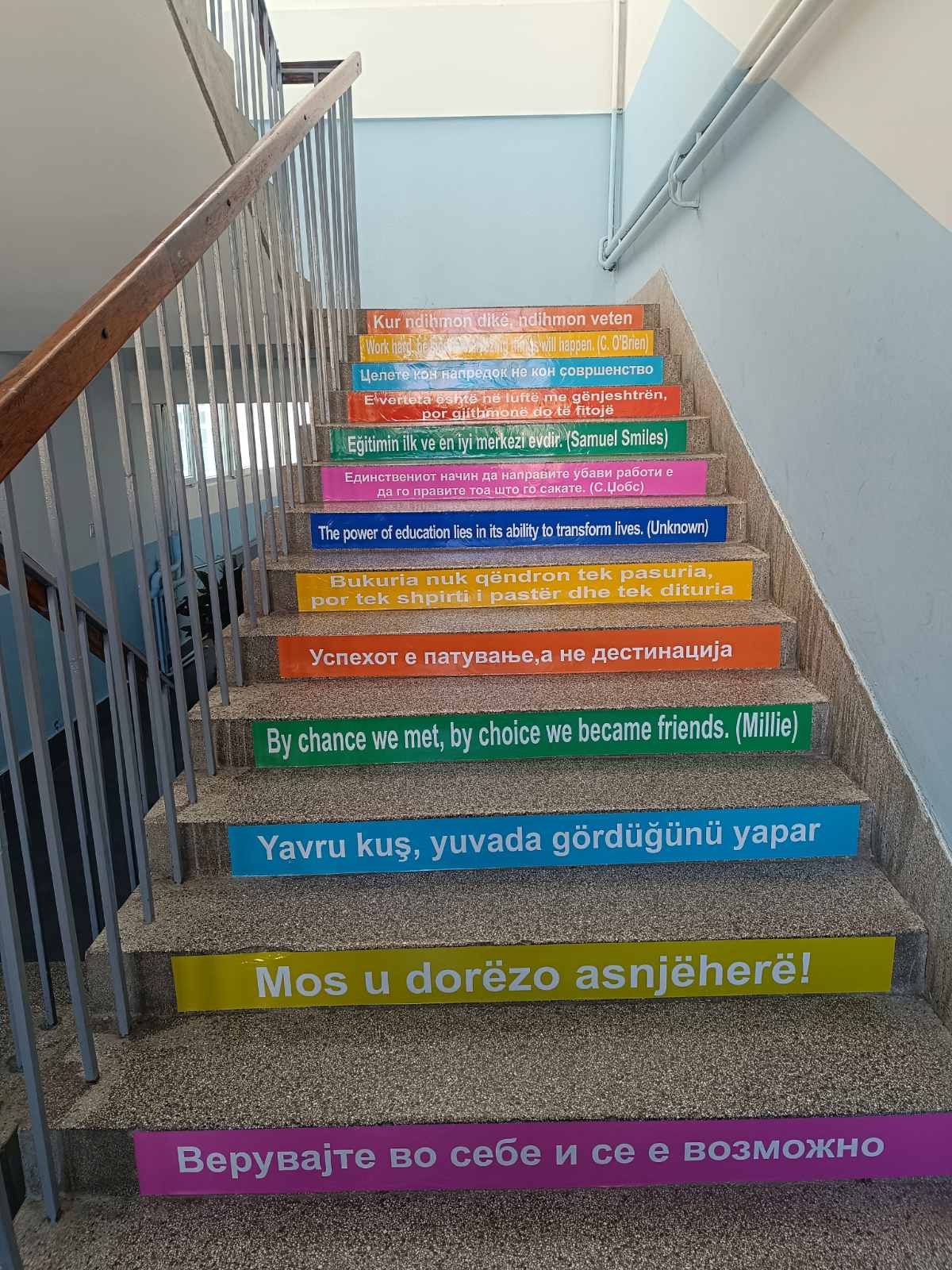 Falë idesë së mësueses sonë Jasmina Kukunešoska, e cila u pranua dhe u mbështet nga drejtoresha e shkollës Znj Albana Zhuta, përmirësuam pamjen e një pjese të shkallëve të vjetra të shkollës sonë. Idea, që lindi nga një punëtori multikulturore me citate në gjuhën angleze nga një projekt i Ministrisë së Arsimit, u shndërrua në një realizim të mrekullueshëm të dekorimit të shkallëve.